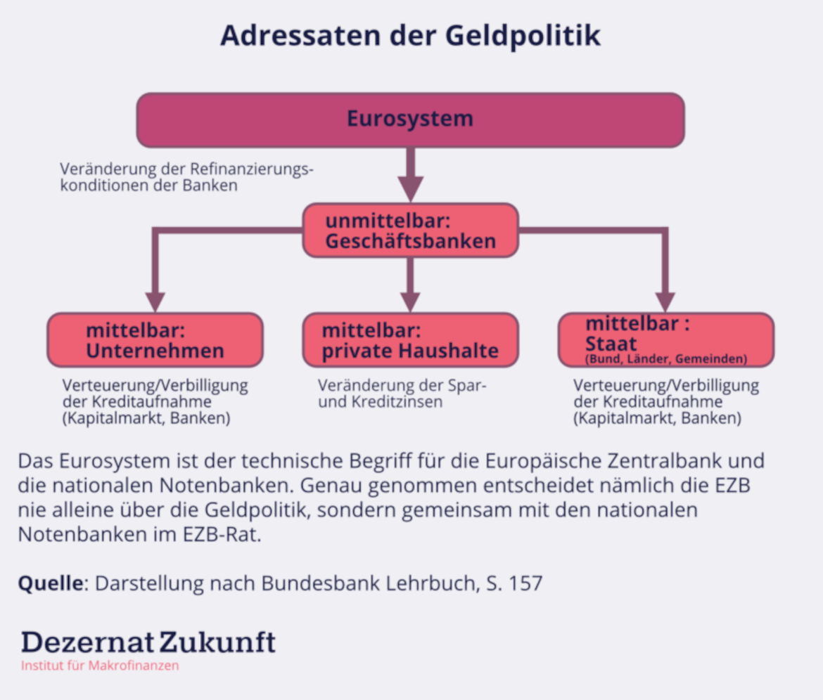 Stattdessen versucht die Zentralbank unter anderem, Einfluss auf die (zukünftige) Kreditvergabe der Geschäftsbanken (bzw. die Kredit- und Konsumnachfrage der Nicht-Banken) zu nehmen, um so die Konsum- und Investitionsnachfrage der Haushalte und Unternehmen zu beeinflussen, die wiederum Auswirkung auf die Entwicklung des Preisniveaus hat.